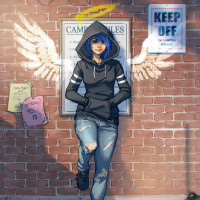 a young woman with blue hair, wearing a hood and sitting on the ground against a brick wall. She appears to be in