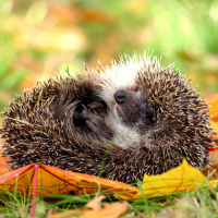 На картинке изображен еж (также известный как дикобраз), свернувшийся и покоящийся на земле среди опавших осенних листьев. Это, кажется, спокойная, мирная сцена с яркими цветами падения вокруг ежа.