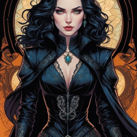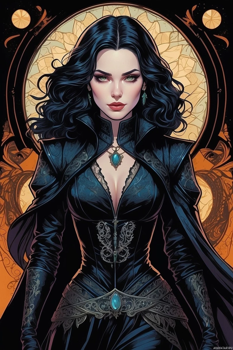 dark hair and fair skin, wearing a black gothic-style outfit with intricate details that suggest a supernatural or fantasy theme. She has sharp features and her gaze is directed towards the viewer. Behind her is a stained glass design resembling a window or portal, which adds to
