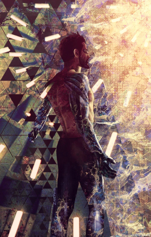 an individual standing with their back turned, looking towards a bright, futuristic-looking background that seems to be emanating energy or particles. The character is wearing a suit that resembles