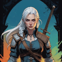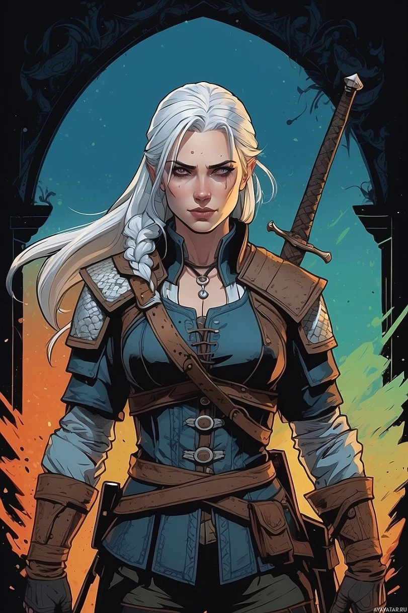 На картинке изображен персонаж, известный как Чири из видеоигры «Ведьмак 3: Дикая Охота». Она изображена в своей воинской одежде, готовой к бою, с светлыми волосами, стилизованными в косы.