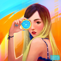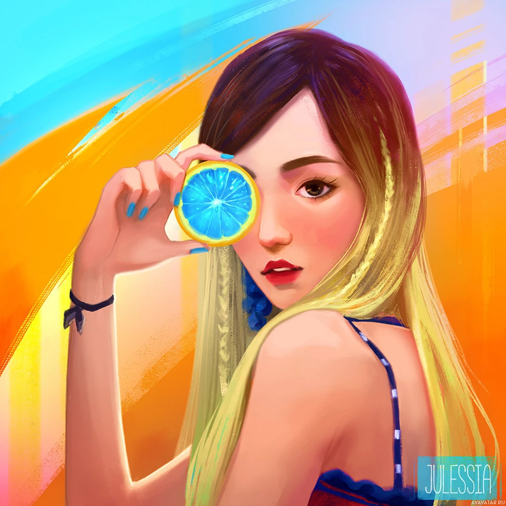 drawing of a girl who appears to be taking a selfie using a slice of lemon. She has