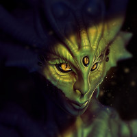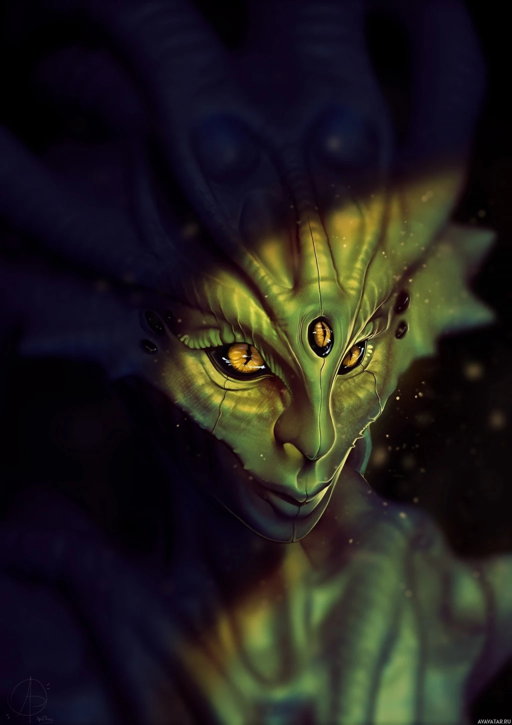 glowing eyes, a serpentine body, and fins on its back that could be interpreted as hair or another kind of appendage. It is depicted in