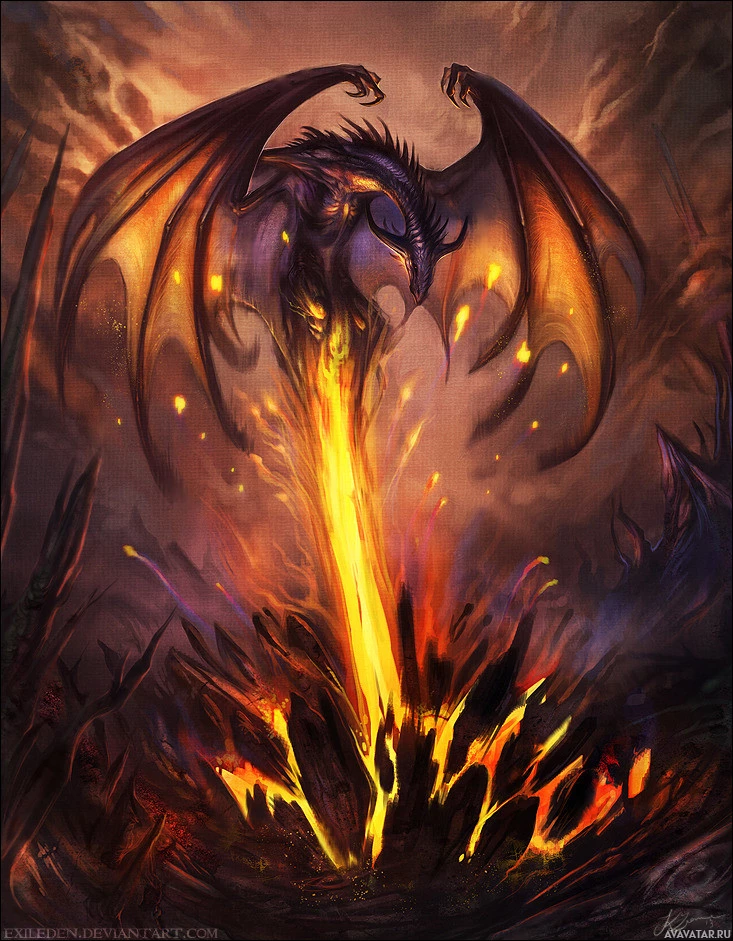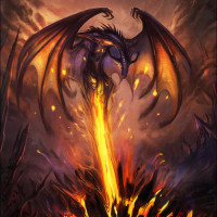 dark clouds and possibly volcanic activity, as evidenced by the lava flow nearby. The artwork is rich in detail and color, capturing a dramatic moment that conveys
