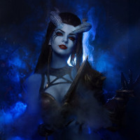 Dota 2's Queen of Pain character, which features blue skin with glowing veins and pointed ears. They are adorned with