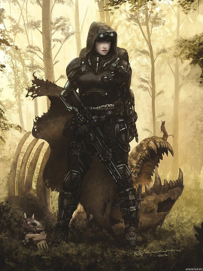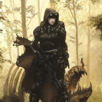 advanced technology or armor, such as the chest plate and gear around her waist. Her head is covered by a hood which obscures her face, and she has a visor over her eyes. In her left hand, she holds what looks like a weapon, possibly a rifle, ready for combat. In the background, there are trees that give off a misty or foggy atmosphere, enhancing the mysterious and potentially