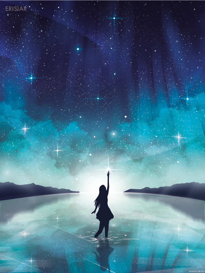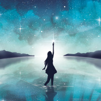 night sky and is looking up towards the stars, with their arm raised in a gesture that could suggest admiration or wonder at the celestial display. The scene has a serene, almost magical quality to it, emphasizing