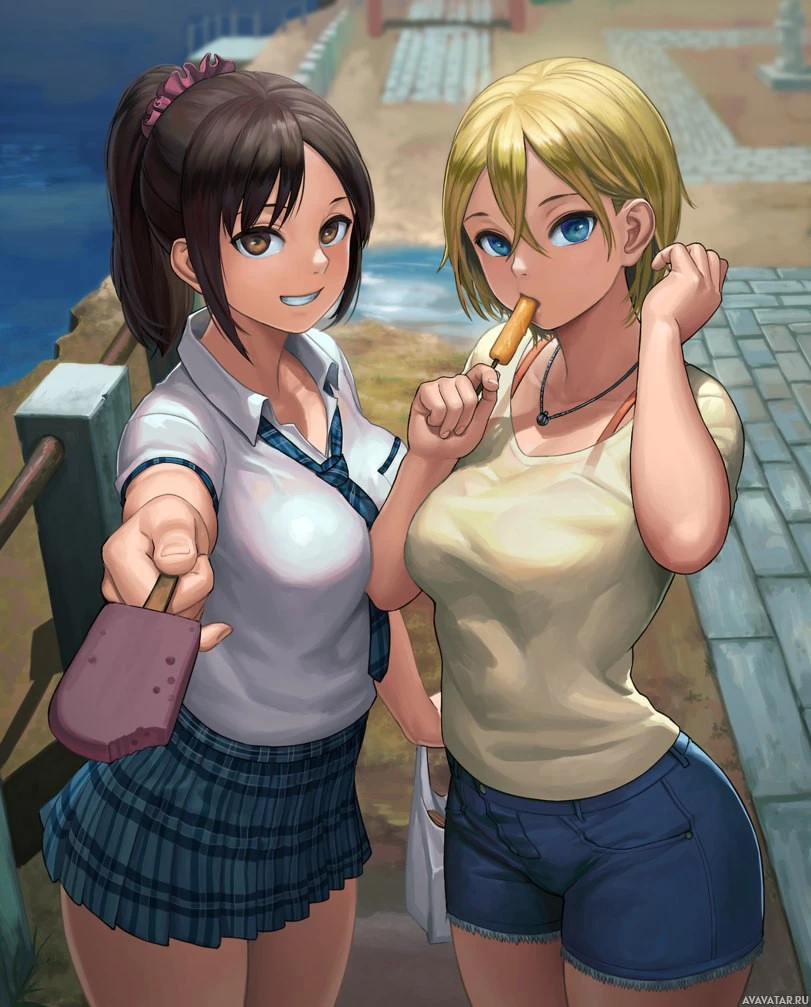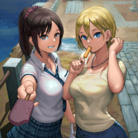 casual setting that might suggest they are partaking in a fun or humorous activity together. The art style and