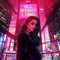 lit streets of Tokyo, Japan. She is standing in front of what appears to be a digital or artistic representation of the city's lights and signs. The text "ALL NIGHT LONG" is prominently displayed in the background, suggesting it might be the title or concept related to this image. The woman is styled with