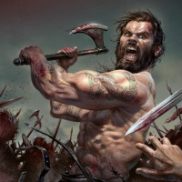 the midst of battle, wielding an axe. He has a beard and mustache, indicative of his rugged appearance. His expression is intense, suggesting that he is in