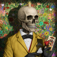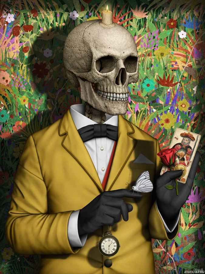 a playing card, possibly the Queen of Spades, which is often associated with death in tarot cards, and it wears a yellow suit jacket that adds a vibrant touch to its appearance. The background is filled with colorful