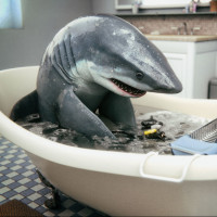 In the image, there is a shark depicted as an anthropomorphic character sitting in a bathtub filled with water. The shark appears to be engaging in a human-like behavior by washing itself or possibly performing a manicure on its flipper. It's a playful and fun image that combines elements of animal life with human activities.
