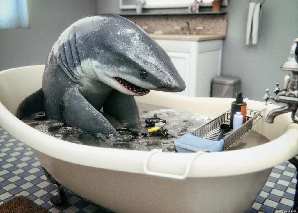 На картинке изображена акула антропоморфного характера, сидящая в ванне, наполненной водой. Акула, по-видимому, ведет себя как человек, умываясь или, возможно, выполняя маникюр на своем флиппере. Это игривый и веселый образ, который сочетает в себе элементы животной жизни с деятельностью человека.