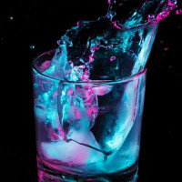 a glowing effect due to the lighting or some added ingredient. The liquid seems to have been poured from a bottle and is overflowing onto the table. The word "water" can be associated with this image because it likely contains water as part of its composition.