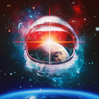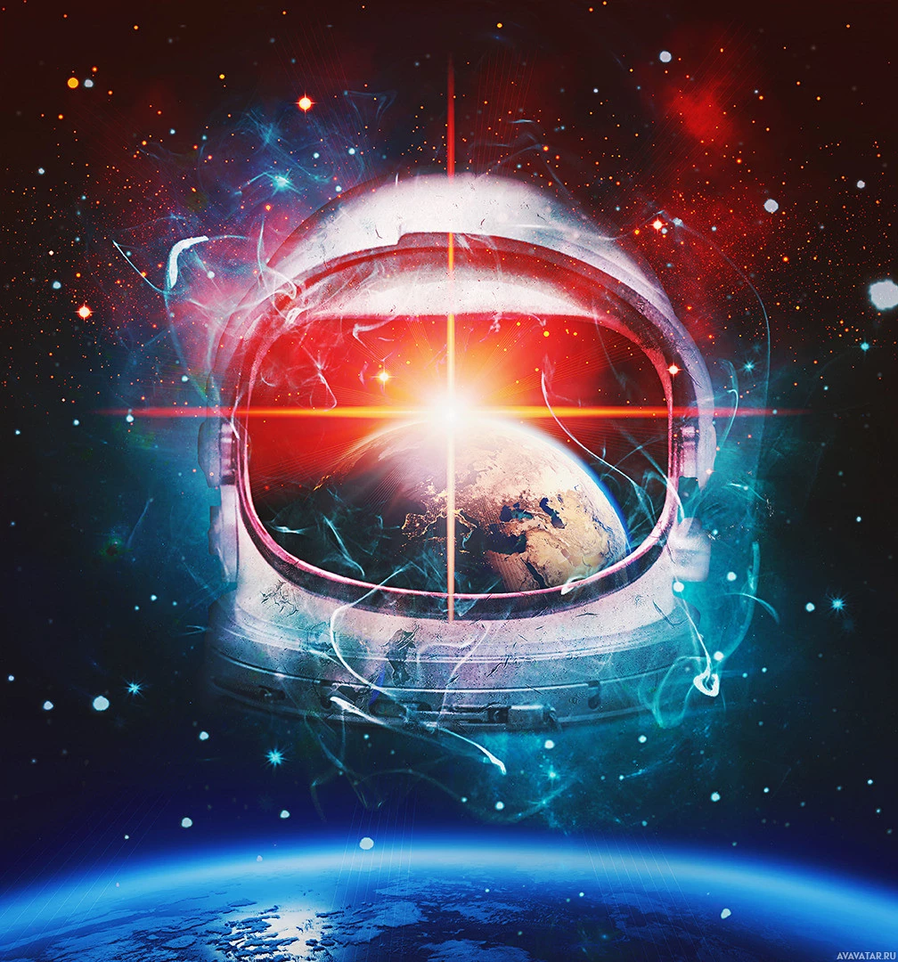 celestial bodies like stars and nebulae, suggesting an extraterrestrial setting. The overall theme of the image conveys themes of