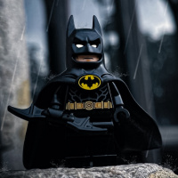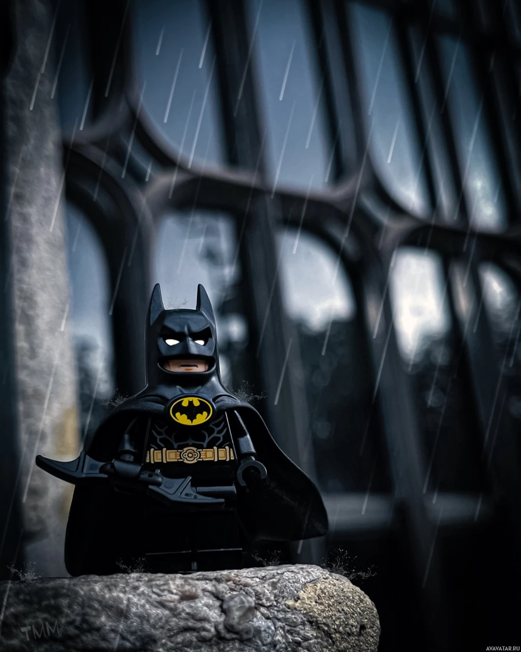 На картинке изображена фигурка Бэтмена Lego, сидящая под дождем. Он расположен так, как будто смотрит в бурную ночь, с темным и дождливым небом на заднем плане. Сеттинг предполагает драматическую или мрачную атмосферу, подходящую для культового персонажа Бэтмена, который известен своей задумчивой персоной.
