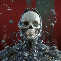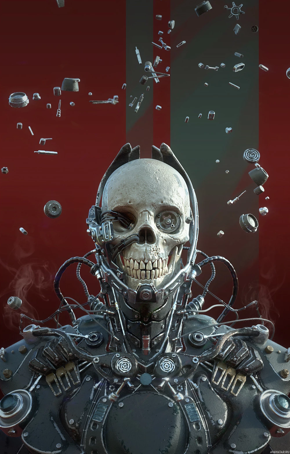 The image features a humanoid figure with a skull as the head, which is a common theme in
