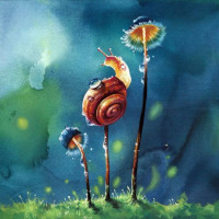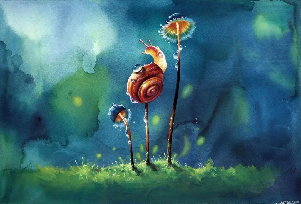 a whimsical scene with a snail on top of a mushroom. The background appears to be painted in