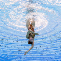 The image shows a person engaged in swimming. They are wearing a swimsuit and appear to be treading water on their back, possibly practicing for a race or exercise. The person's face is not visible from this angle, and they seem focused on