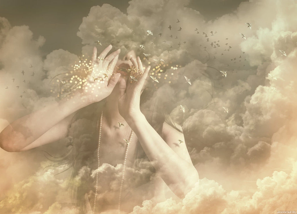deep thought or possibly experiencing some form of disorientation. She appears to be looking away from the viewer, perhaps at something else that isn't visible in the picture. Surrounding her are cloud-like forms and particles that give
