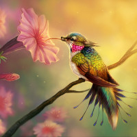 long bill extended towards one of the flowers, possibly nectar-gathering. The colors and details suggest this might be digitally painted, adding