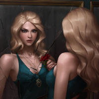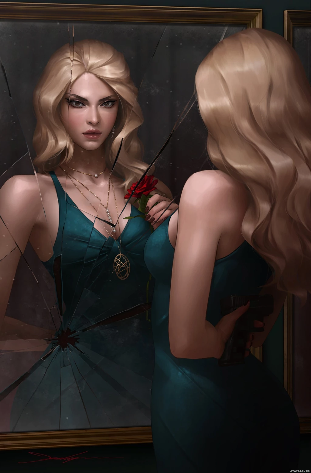 a blonde girl looking at her own reflection in a mirror. She has an elegant and somewhat melancholic expression on her face, which might suggest that she is deep in thought or perhaps reflecting on something troubling or significant. The character is dressed in