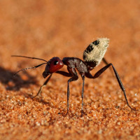 На снимке изображено насекомое, похожее на пустынного муравья. Оно отличается небольшими размерами, шестью лапками и усиками. Судя по фону, оно находится на песчаной почве, что характерно для пустынь, где, как известно, эти муравьи процветают.