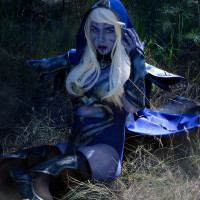 This is an image of a person dressed as Drow Ranger, a popular cosplay from