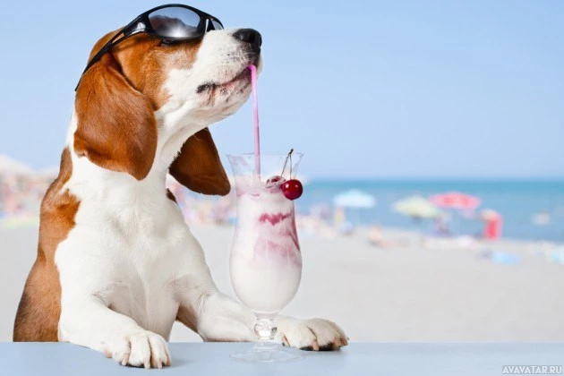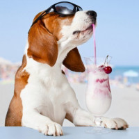 the sandy ground and the ocean visible in the background. There are also people enjoying the beach in the distance. This image is likely intended to be humorous, as it depicts a dog "enjoying" a drink like a human, complete with sunglasses for a stylish appearance.