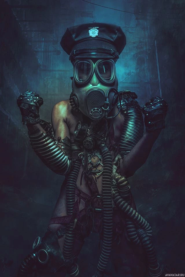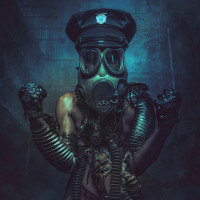 a gas mask and what appears to be military or police uniform. They have their arms outstretched, possibly imitating a pose of authority or action, set against a dark and foreboding background that resembles an underground or industrial setting. The gas mask suggests themes of protection from hazardous environments or