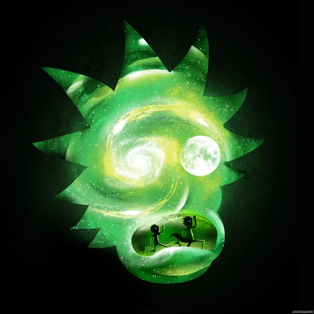 television series "Rick and Morty," set against a backdrop that resembles a galaxy. The background is predominantly dark with stars visible in the upper left corner. There's also a green swirling pattern that could be representing a nebula or galactic phenomenon, which adds to