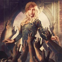 blonde hair who appears to be in a state of distress or despair. This character is surrounded by hands reaching towards them from all directions, suggesting a crowd or gathering. The setting has an ornate architectural style with a large