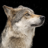 the head of a wolf. It appears to be an adult with its fur and facial features clearly visible, including its ears, eyes, snout, and whiskers. The background is blurred but suggests it could be outdoors due to the presence of what looks like rain or falling snowflakes, indicated by