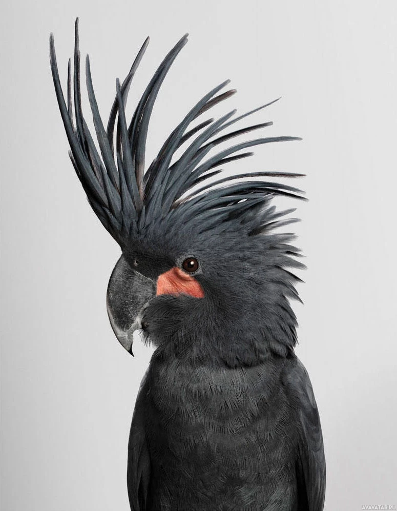 a black parrot. This bird is characterized by its crest of feathers on top of its head, which stands upright like a mohawk, and a sharply