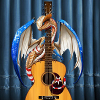 flag design on its neck. On top of this guitar, perched as if playing or about to play it, is a dragon. The dragon has wings that are blue and red, colors commonly associated with