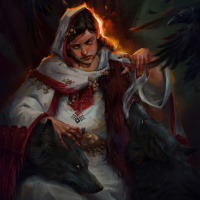 a large wolf sitting calmly. The setting seems to be a forest or a mystical place with a dark and