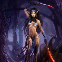 dark hair and pointed ears, wearing armor that includes elements like spiked shoulder pads and a leather corset. She is wielding two large blades, one in each hand, and has