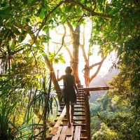 The image shows a person walking on a suspension bridge in what appears to be a jungle or rainforest setting. The individual is from behind, and there are trees visible around the bridge. It seems like it could be a sunny day given the lighting and shadows.