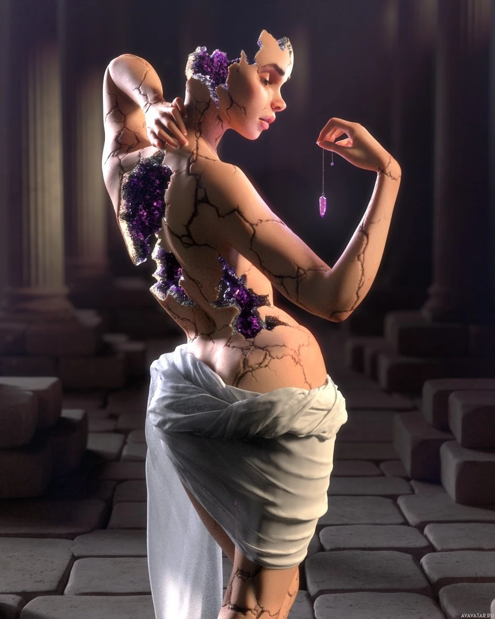 a complex design resembling purple rocks or crystals meticulously arranged on her skin. The overall atmosphere suggests a theme blending