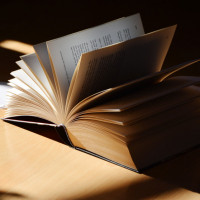 The image shows a stack of books on a table. There's natural light shining on the pages, creating a warm glow and casting shadows on the surface beneath. The books appear to be hardcover, suggesting they may contain substantial content or academic material. The setting seems peaceful and conducive for reading or studying.