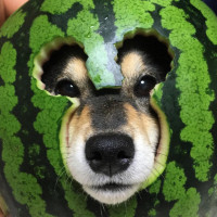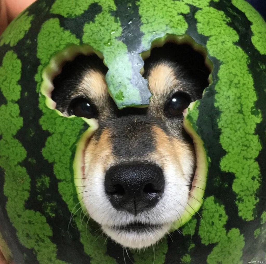 the cut top of a watermelon. The dog appears to be looking directly at the camera, and its fur is black and brown in color. This type of image is commonly used for humorous effect or as part of internet memes, showcasing