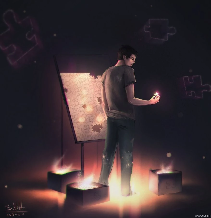 a puzzle piece in his hand, suggesting he may be working on a puzzle or examining something closely. In front of him, there is a map that seems to have been damaged, possibly from a previous puzzle or attempt at solving it. The setting has an eerie ambiance with dim lighting and floating pieces of paper or debris around the man's head, contributing to
