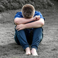 The picture shows a person sitting on the grass with their head down and hands clasped in front of them. They appear to be resting or possibly upset. It is not possible to definitively determine the gender of the individual based solely on this image, so it could be