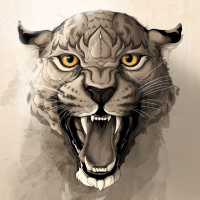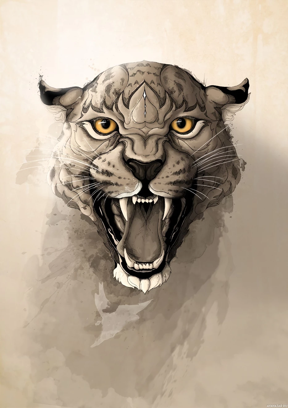 На картинке изображен рисунок или иллюстрация головы пумы. Он изображен с широко открытым ртом, как будто ревет или рычит. Стиль кажется реалистичным, с вниманием к деталям, что придает ему реалистичный вид.