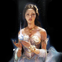 light effects around her, suggesting she may have some sort of mystical or divine power. Her expression is calm and focused, and the overall aesthetic is one of enchantment and magic. The image is likely intended to represent a princess or sorceress archetype within