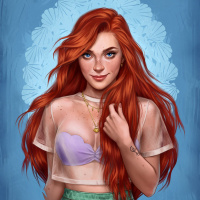 a neutral expression on her face and is looking directly at the viewer. She appears to be a young adult female with a light complexion. Her attire includes a top with cutouts over her chest and shoulders, reminiscent of traditional mermaid-like designs. The character's overall appearance suggests she might be inspired by an animated