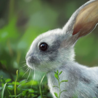 На картине изображен молодой заяц с видными ушами и глазами, стоящий на траве. Похоже, что он находится в естественной обстановке, возможно, в поле или лесу. Художественная работа детализирована и красочна, запечатлевая сущность типичного дикого кролика.