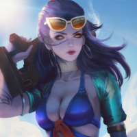 The image shows a female character from the video game "Overwatch," known as Widowmaker. She is depicted wearing her signature purple and blue outfit with sunglasses, a gun holster, and holding a sniper rifle. This style of artwork is often referred to as fan art or cosplay art.