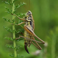 На снимке изображен кузнечик. Кузнечики известны своей отличительной способностью прыгать и классифицируются как насекомые. Они обычно встречаются в травянистых областях, как показано на фоне, который выглядит как трава или низкая растительность.