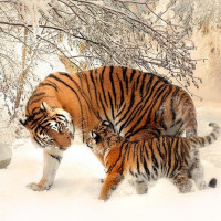 На снимке изображены два тигра в снежной среде. Слева — взрослый тигр, справа — молодой тигр или детеныш. Они, кажется, проходят через то, что выглядит как слегка падающий снег, и вокруг них есть деревья с заснеженными ветвями. Это спокойная зимняя сцена с дикой природой.